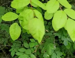 幼枝密被针刺及宽扁大形紫色皮刺,小叶片上面叶脉明显,…