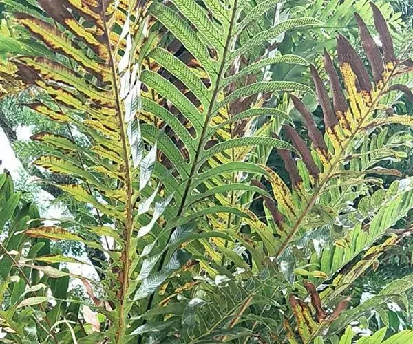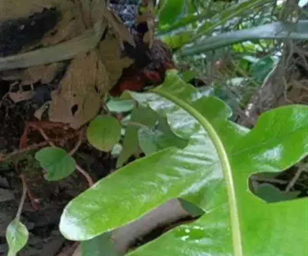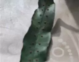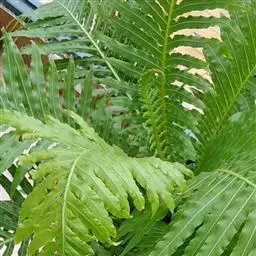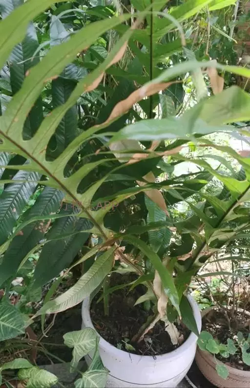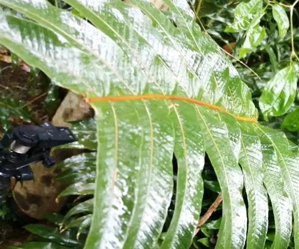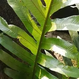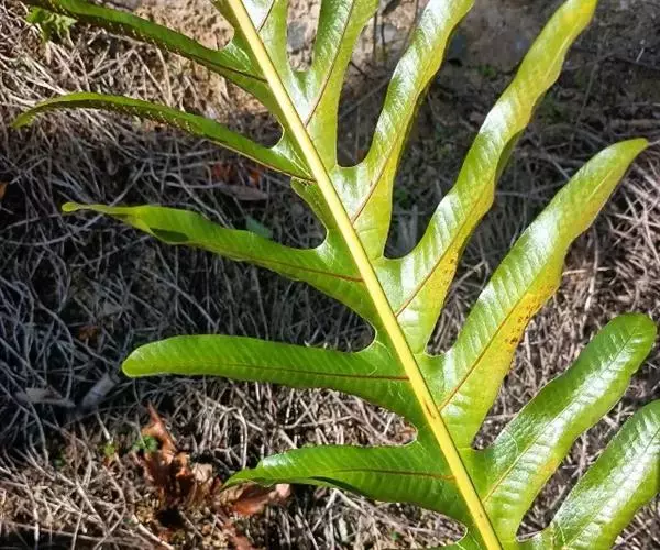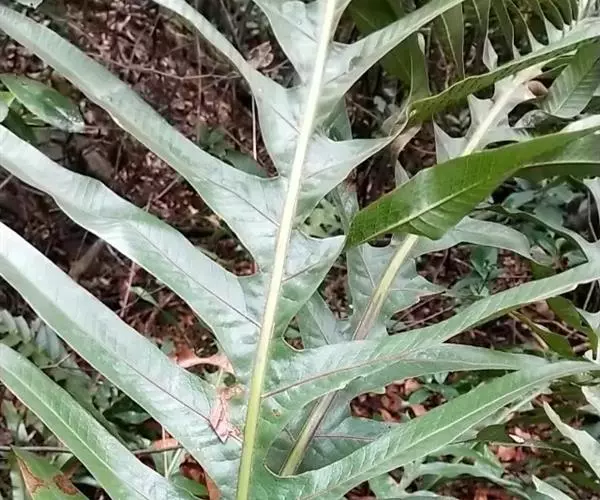 叶一型,长圆状倒披针形,长80-120厘米或过之,中部宽20-30厘米,顶端渐尖,向下渐变狭,至下约1/4处狭缩成宽1-2厘米的翅,至基部又渐扩张成膨大的圆心脏形,宽约15-25厘米,有宽缺刻或浅裂的边缘,基部以上叶片为羽状深裂,再向上几乎深裂到叶轴;裂片多数,斜展或略斜向上,被圆形的缺刻所分开,披针形,中部的裂片长达15-22厘米,宽2-3厘米,急尖头或圆头,为阔圆形的缺刻所分开;叶脉粗而很明显,侧脉斜展,隆起,通直,相距4-5毫米,向外达于加厚的边缘,横脉与侧脉直角相交,成一回网眼,再分割一次成3个长方形的小网眼,内有顶端成棒状的分叉小脉;叶硬革质,两面均无毛,干后硬而有光泽,裂片往往从关节处脱落。孢子囊群位于小脉交叉处,叶片下半部通常不育,4-6个生于侧脉之间,但并不位于正中央,而是略偏近下脉,每一网眼内有1个孢子囊群,在主脉与叶缘间排成一长行,圆球形或长圆形,分离,但成熟后常多少汇合成一连贯的囊群线。