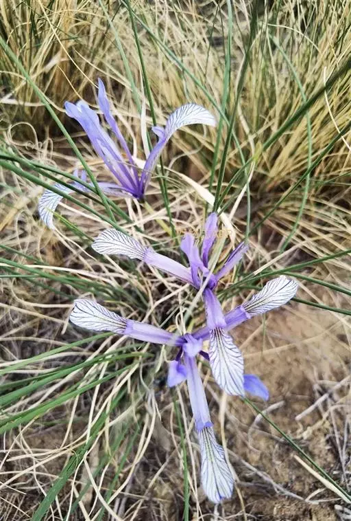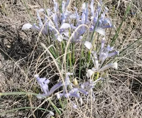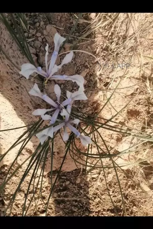 细叶鸢尾(学名:Iris tenuifolia Pall.):多年生密丛草本,植株基部存留有红褐色或黄棕色折断的老叶叶鞘,根状茎块状,短而硬,木质,黑褐色;根坚硬,细长,分枝少。叶质地坚韧,丝状或狭条形。花茎长度随埋砂深度而变化,通常甚短,不伸出地面;苞片4枚,披针形,内包含有2-3朵花;花蓝紫色,直径约7厘米;外花被裂片匙形,爪部较长,内花被裂片倒披针形,直立。蒴果倒卵形,顶端有短喙,成熟时沿室背自上而下开裂。花期4-5月,果期8-9月。