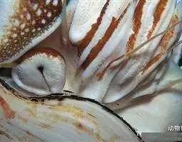 螺壳构造 其外壳呈螺旋形,贝壳弯曲,在平面上作背缘旋转,呈圆盘形。贝壳左右对称。壳面光滑,呈灰白色,具有多条红褐色的火焰条状斑纹,生长纹细密。内部表面为珍珠层,被分隔成许多独立的小房间(解剖发现最多的有38个隔断),各隔断之间有一根体管相连通,通过控制房间内的气体排放来完成身体在水中的升降,最外边的一间是最大的,用于存放鹦鹉螺的身体。鹦鹉螺有90只腕手,无吸盘,为叶状或丝状的触手,用于捕食及爬行,其中有两个合在一起变得很肥厚,当肉体缩到贝壳里的时候,用它盖住壳口,这与腹足类的厣的作用相当,在休息时,总会有几条触手负责警戒。在所有触手的下方,有一个类似鼓风夹子的漏斗状结构,通过肌肉收缩向外排水,以推动鹦鹉螺的身体向后移动。