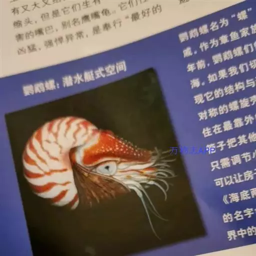 鹦鹉螺有螺旋状外壳的软体动物,是现代章鱼、乌贼类的亲戚。鹦鹉螺的贝壳很美丽,构造也颇具特色,这种石灰质的外壳大而厚,左右对称,沿一个平面作背腹旋转,呈螺旋形。贝壳外表光滑,灰白色,后方间杂着许多橙红色的波纹状,壳有两层物质组成,外层是磁质层,内层是富有光泽的珍珠层。被截剖的鹦鹉螺,像是旋转的楼梯,又像一条百褶裙,一个个隔间由小到大顺势旋开,它决定了鹦鹉螺的沉浮,这正是开启潜艇构想的钥匙,世界上第一艘蓄电池潜艇和第一艘核潜艇因此被命名为“鹦鹉螺号”。