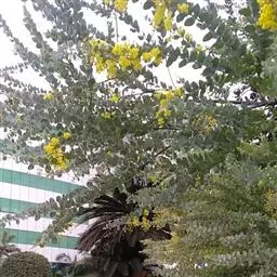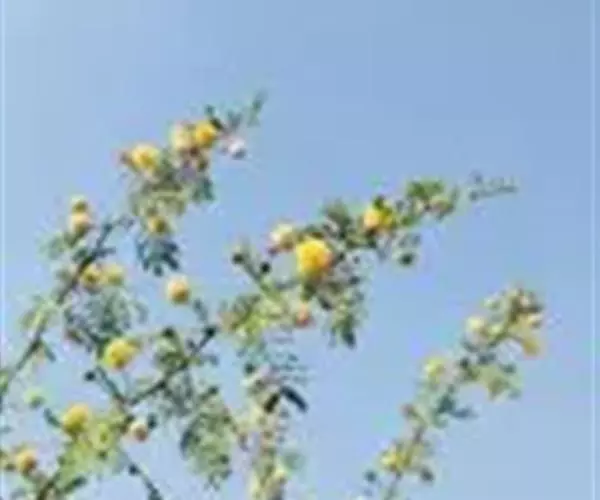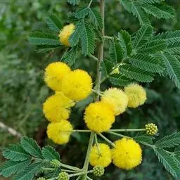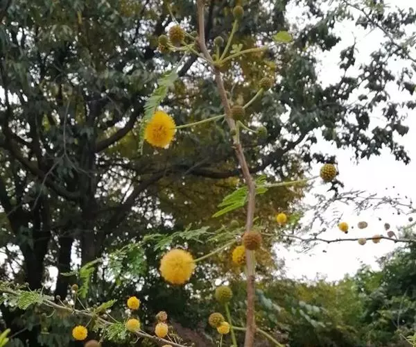 金合欢(学名:Acacia farnesiana (Linn.) Willd.),别名:鸭皂树、刺球花、消息树等;灌木或小乔木,树皮粗糙,褐色,多分枝,小枝常呈“之”字形弯曲,有小皮孔。托叶针刺状,生于小枝上的较短。二回羽状复叶,叶轴糟状,被灰白色柔毛,羽片4-8对。花黄色,有香味;子房圆柱状,被微柔毛。荚果膨胀,近圆柱状,褐色,无毛,劲直或弯曲;种子多颗,褐色,卵形,花期3-6月;果期7-11月。