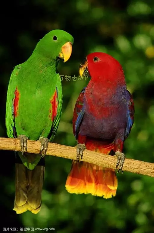 折衷鹦鹉(学名:Eclectus roratus),又名红胁绿鹦鹉,它的名称“折衷”名称是由“Eclectic”一字而来,意思是折衷的、公母鸟表现出截然不同羽色的意思。这种鹦鹉是所有鹦鹉中两性外表差异最明显的种类,雌鸟鲜红色的羽色与雄鸟亮眼的绿色形成强烈对比。是典型的攀禽,鸟喙强劲有力,喙钩曲,上颌具有可活动关节,喙基部具有腊膜。肌肉质舌厚。脚短,强大,对趾型,两趾向前两趾向后,适合抓握和攀援生活。羽毛。晚成雏。主要栖息于热带雨林和低地森林当中。食物主要是种子、浆果、水果、坚果、昆虫以及其幼虫等,通常成对活动,繁殖期聚小群,属于留鸟。主要分布于印度尼西亚、新几内亚、澳大利亚等地区。