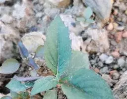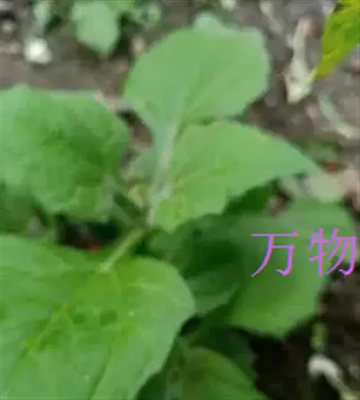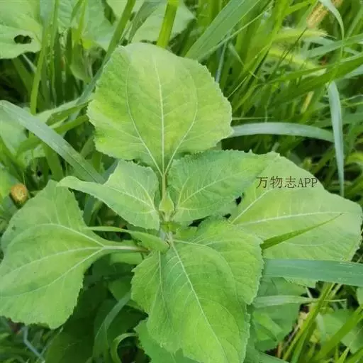 2、腺梗豨莶,本品枝上部被长柔毛和紫褐色腺点;叶圆形或卵形,边缘有不规则小锯齿。