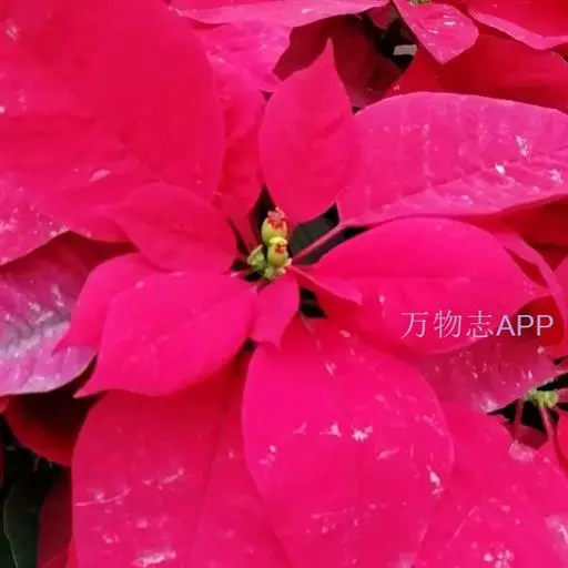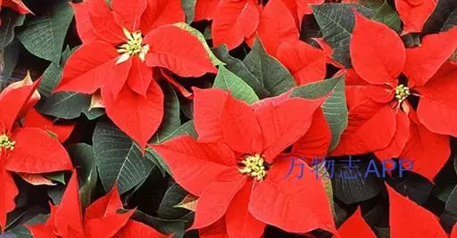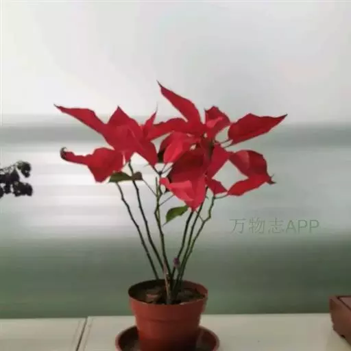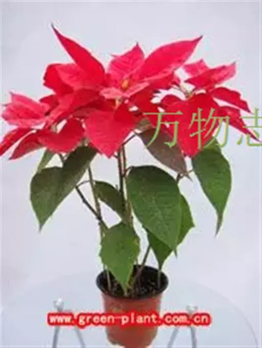 一品红为常绿灌木。茎直立,含乳汁。叶互生,卵状椭圆形,下部叶为绿色,上部叶苞片状,红色。花序顶生。常见品种有