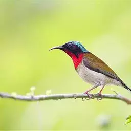叉尾太阳鸟,雀形目太阳鸟科太阳鸟属留鸟;为小型鸟类,雄鸟头顶辉蓝绿色,上体橄榄绿色,腰明黄色,…
