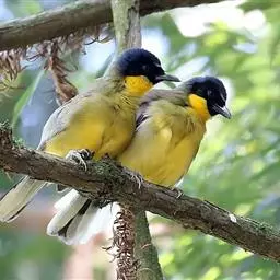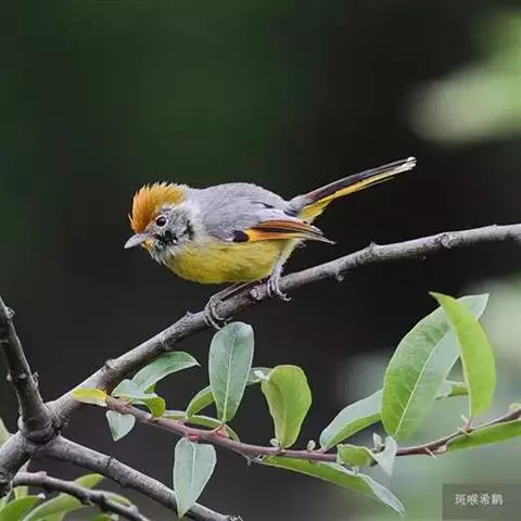 黄喉噪鹛体型略小,顶冠蓝灰色,特征为具黑色的眼罩和鲜黄色的喉。上体褐色,尾端黑色而具白色边缘,…