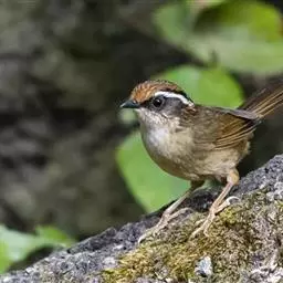 玉山噪鹛中等体型的褐色鸟类。白色长眉纹及髭纹显著;顶冠灰而具白色的鳞状斑纹;脸侧及颏褐色,…