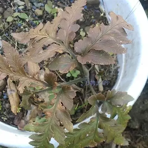 叶密生,二型;柄长10-30厘米(不育叶的柄较短),粗1.5-2毫米,与叶轴同为禾秆色,稍光泽,光滑;叶片长圆状卵形,长10-25厘米(不育叶远比能育叶短),宽5-15厘米羽状,羽片3-6对,对生,稍斜向上,上部的无柄,下部的有短柄;不育叶的下部羽片相距1.5-2(3)厘米,三角形,尖头,长2.5-3.5(8)厘米,宽1.5-2.5(4)厘米,常为羽状,小羽片2-3对,对生,密接,无柄,斜展,长圆状倒卵形至阔披针形,先端钝圆,基部下侧下延下部全缘,上部及先端有尖齿;能育叶的羽片疏离(下部的相距5-7厘米),通常为2-3叉,中央的分叉最长,顶生羽片基部不下延,下部两对羽片有时为羽状,小羽片2-3对,向上,狭线形,先端渐尖,基部下侧下延,先端不育的叶缘有密尖齿,余均全缘主脉禾秆色,下面隆起;侧脉密接,通常分叉。叶干后草质,灰绿色至褐绿色,无毛。 [2-3]