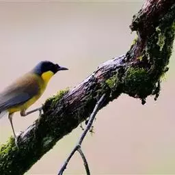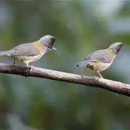 黄喉噪鹛体型略小,顶冠蓝灰色,特征为具黑色的眼罩和鲜黄色的喉。上体褐色,尾端黑色而具白色边缘,…