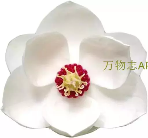 花与叶同时开放,白色,芳香,杯状,盛开时碟状,直径7-10厘米;花梗长3-7厘米,密被褐色及灰白色平伏长柔毛,着生平展或稍垂的花朵;花被片9,近等大,外轮3片长圆状倒卵形或倒卵形,长4-6厘米,宽2.5-3.5厘米,基部被白色毛,顶端宽圆或圆,内两轮6片,较狭小,基部渐狭成短爪;雄蕊紫红色,长9-11毫米,花药长约6毫米,两药室邻接,内向纵裂,顶端微凹或药隔平,不伸出,花丝长3-4毫米;雌蕊群椭圆形,绿色,长约1.5厘米。聚合果熟时红色,倒卵圆形或长圆体形,长2-7厘米;蓇葖狭椭圆体形,长约1厘米,沿背缝线二瓣全裂。顶端具长约2毫米的喙;种子心形,假种皮橘红色,外种皮深褐色,长与宽6-7毫米,顶孔细小末端具尖。