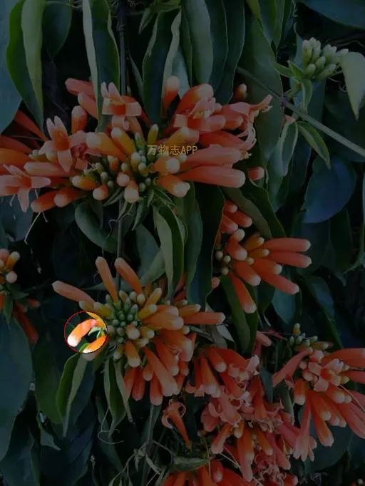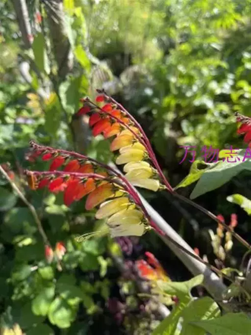 金鱼花(学名:Mina lobata Cerv.)是旋花科,金鱼花属多年生向左旋缠绕草本植物,茎无毛,叶片3裂或全缘。聚伞花序,长达35cm,花偏向一侧;花冠管状,具棱略弯,口部呈坛状,初红色,渐转为淡黄色至白色;叶面浓绿色,多于春季开花,花期20余天。