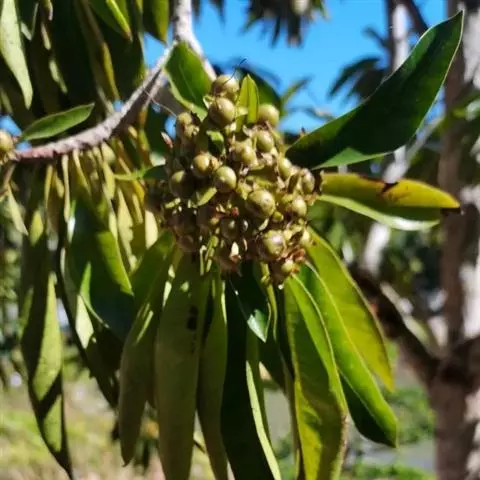 轮叶蒲桃 果实呈紫黑色时进行采摘,1千克种子3400粒左右,采后堆沤软化果皮,上覆盖稻草。2-4周后,用流水淘洗漂去果肉,分离出潮湿的种子,然后进行阴处晾干,沙藏到第二年春3月下旬播种。选壤土pH值5-6,在细耕土地后,每亩撒施有机肥500千克后,做苗床宽1.1米,高20厘米,长度根据田块大小而定,平整苗床土地。要求播种均匀,种籽播后及时覆盖细黄心土,覆盖厚度约1-2厘米,再盖上稻草或郎衣(如搭小弓棚用塑料薄膜覆盖可提早出苗,苗木相对整齐),5月中旬出苗后及时揭开。针对苗木的生长状况,根据薄肥勤施的原则,一般用速溶复合肥2‰-3‰溶液进行喷洒,时间7-10天1次,也可以结合根外施肥,同时进行病虫害的防治与管理工作。为抑制苗木徒长,促进苗木木质化,切断主根促进侧根生长,以提高苗木移植成活率,时间应在秋季为宜。