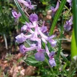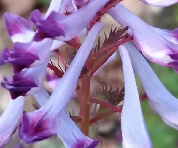 总状花序长3-12厘米,多花,先密集,后疏离。苞片约与花梗等长,菱形或楔形,具缺刻状齿。花梗长约1厘米。萼片小,长约1毫米,丝状深裂。花紫红色至紫色,稀淡蓝色至苍白色,平展,大小的变异幅度较大。外花瓣顶端圆钝,平截至多少下凹,顶端稍后具陡峭的鸡冠状突起。上花瓣长(1.6-)2-2.5厘米;距圆筒形,近直,约与瓣片等长或稍短;蜜腺体短,约占距长的1/4至1/3,末端稍圆钝。下花瓣基部常具小距或浅囊,有时发育不明显。内花瓣顶端深紫色。