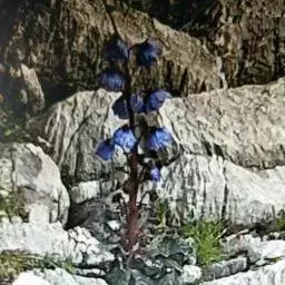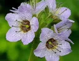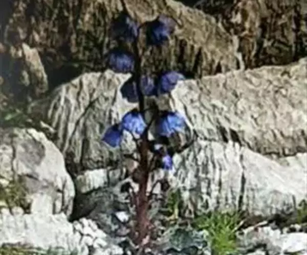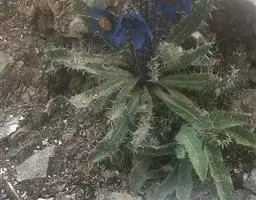 多年生一次结实草本,可高达90cm。茎直立,圆柱状,粗5-10mm;被硬毛叶:全部基生,莲座状;叶柄具狭翅:表面蓝绿色,反面灰绿;正面被基部黑紫色刺毛,中脉在叶背隆起:叶缘波状至浅裂。花:花序总状,有花数十朵;花侧向或稍俯垂,直径44-84cm;花梗07-85cm,被稀疏刺毛;花瓣5-7枚,蓝色至紫色,偶尔浅蓝色或紫红色;花丝与花瓣同色或较之更深,花药灰色或黄灰色;子房卵形,密被刺毛;花柱狭圆柱形,1-3mm;柱头黄色,伸出雄蕊群之外一果实:蒴果,卵形,被直立刺毛,宿存花柱6-7mm,花期6-9月,果期7-10月。