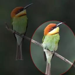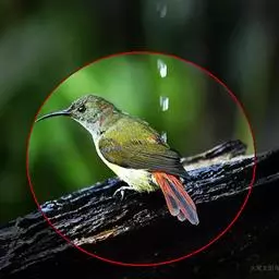 雄性成鸟 整体大致绿色,下体显著较淡,头部较辉亮;喉部有一蓝色块斑;腰和尾上覆羽红色;翅底面蓝绿色;尾羽上绿下蓝。雌性成鸟 整体略较苍暗,喉部蓝斑不显或缺如。
