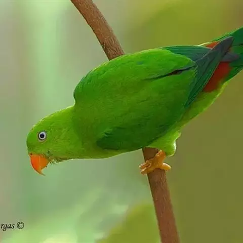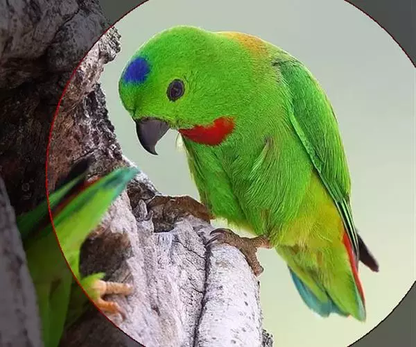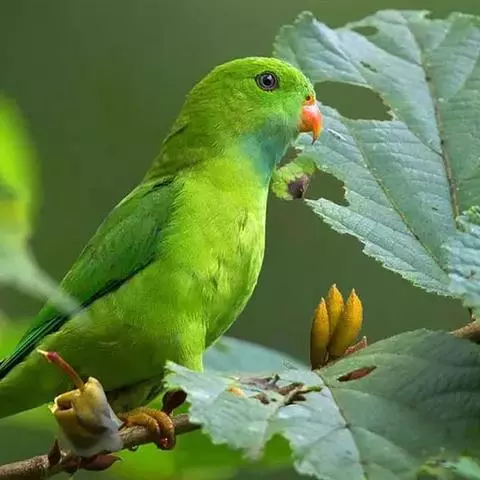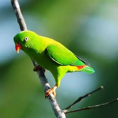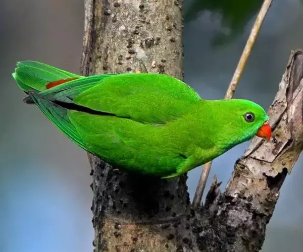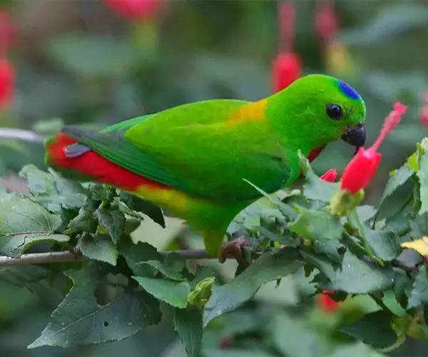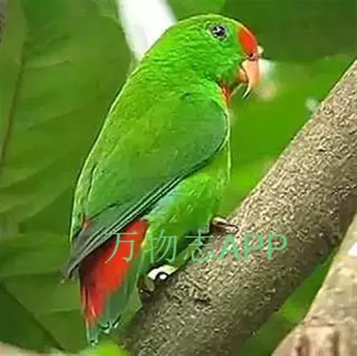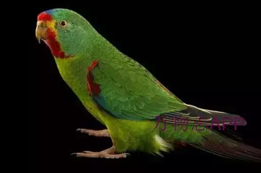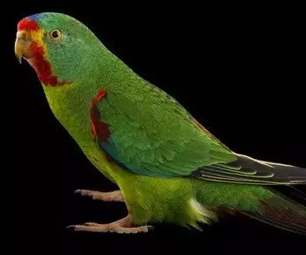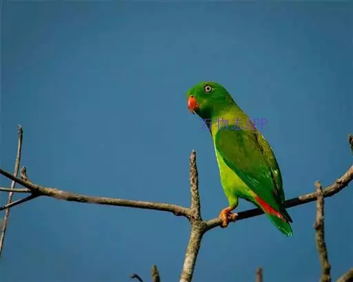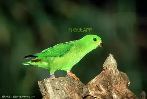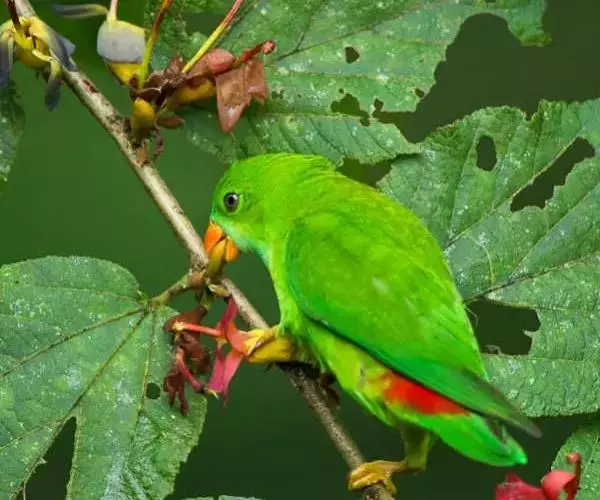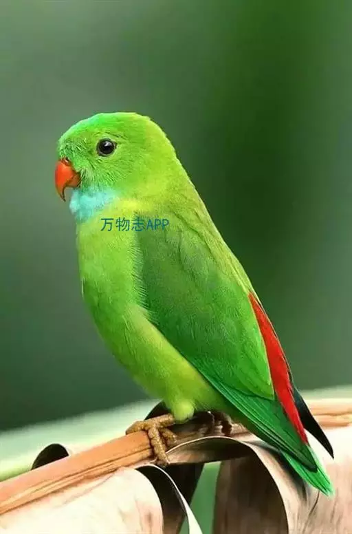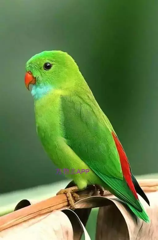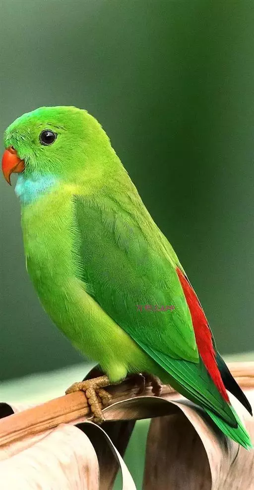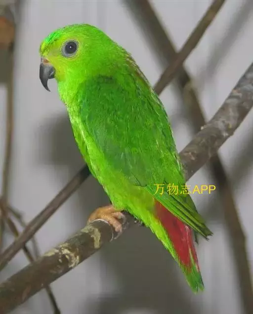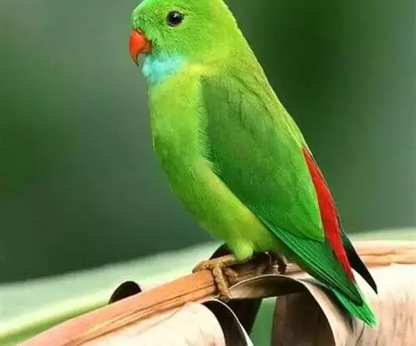 短尾鹦鹉(学名:Loriculus vernalis)是典型的攀禽,体形小,翅长在90毫米左右;尾较翅短;嘴较细削,其厚度不及嘴峰长度;腰下有朱红色块斑;雄鸟喉部有蓝色块斑。鸟喙强劲有力,喙钩曲,上颌具有可活动关节,喙基部具有腊膜。肌肉质舌厚。脚短,强劲有力,对趾型,两趾向前两趾向后,适合抓握和攀援生活。体羽主要是绿色,红嘴红腰,翼下为青绿色带绿色翼衬。