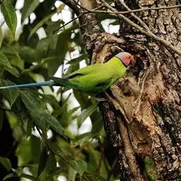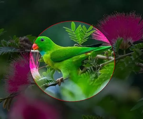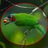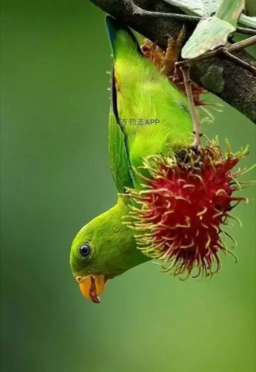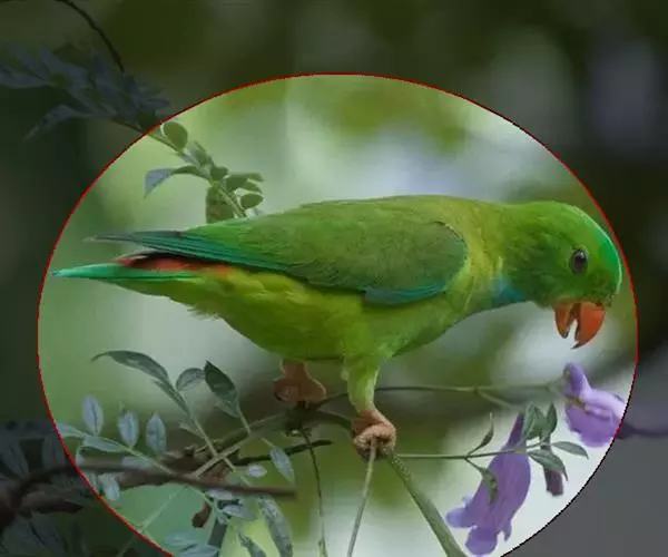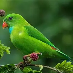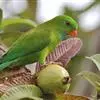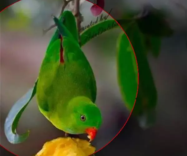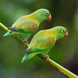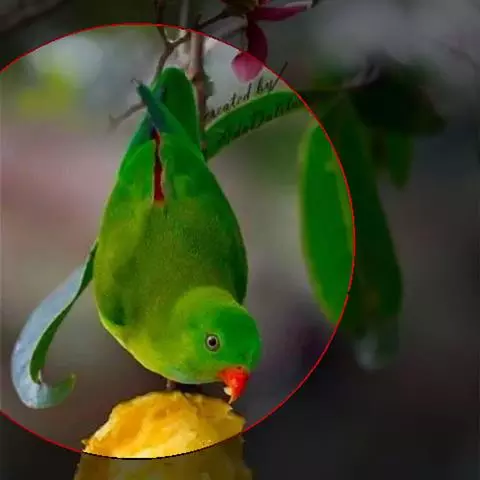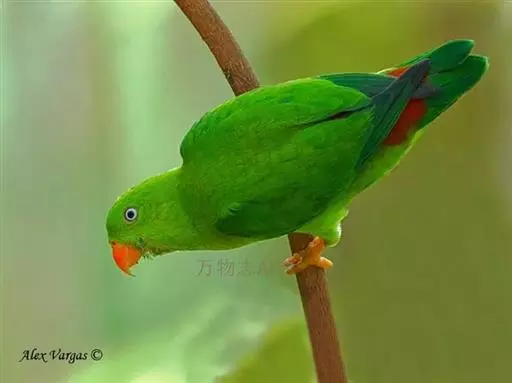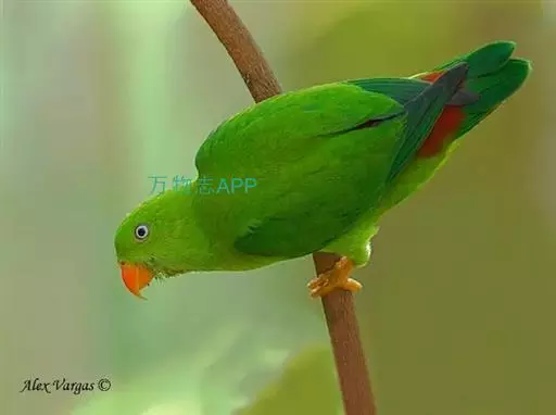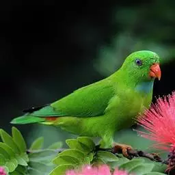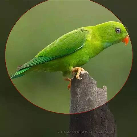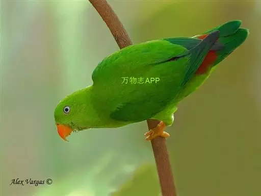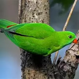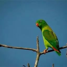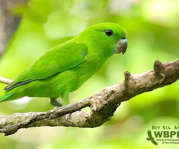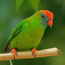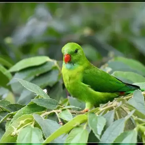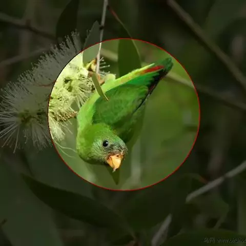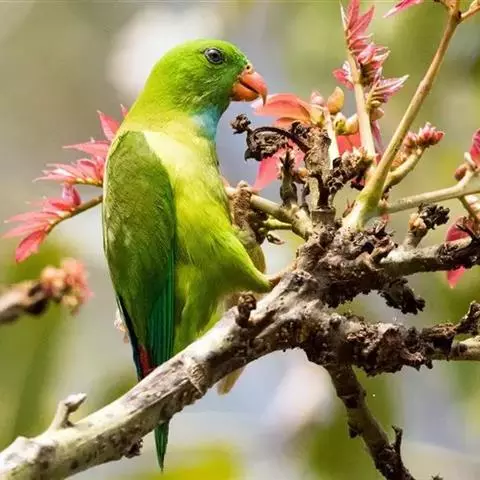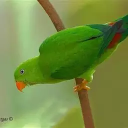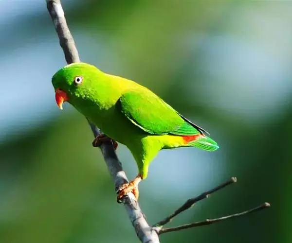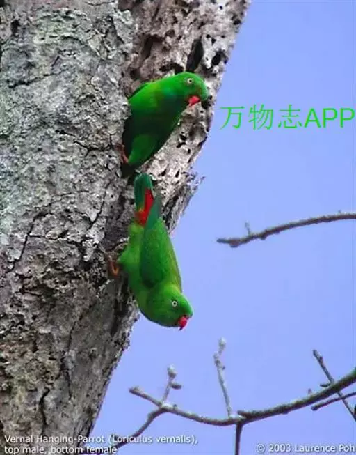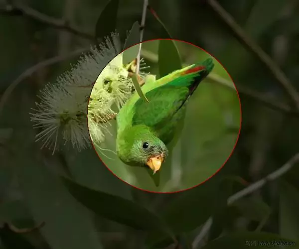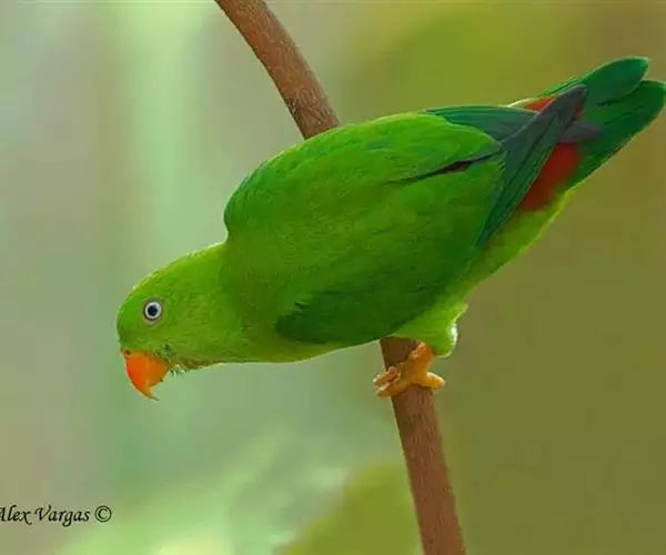 短尾鹦鹉(学名:Loriculus vernalis)是典型的攀禽,体形小,翅长在90毫米左右;尾较翅短;嘴较细削,其厚度不及嘴峰长度;腰下有朱红色块斑;雄鸟喉部有蓝色块斑。鸟喙强劲有力,喙钩曲,上颌具有可活动关节,喙基部具有腊膜。肌肉质舌厚。脚短,强劲有力,对趾型,两趾向前两趾向后,适合抓握和攀援生活。体羽主要是绿色,红嘴红腰,翼下为青绿色带绿色翼衬。