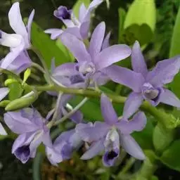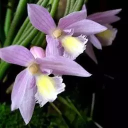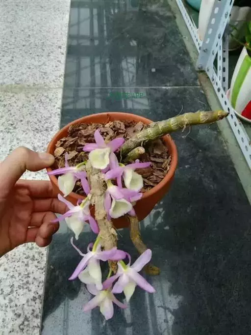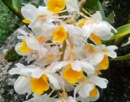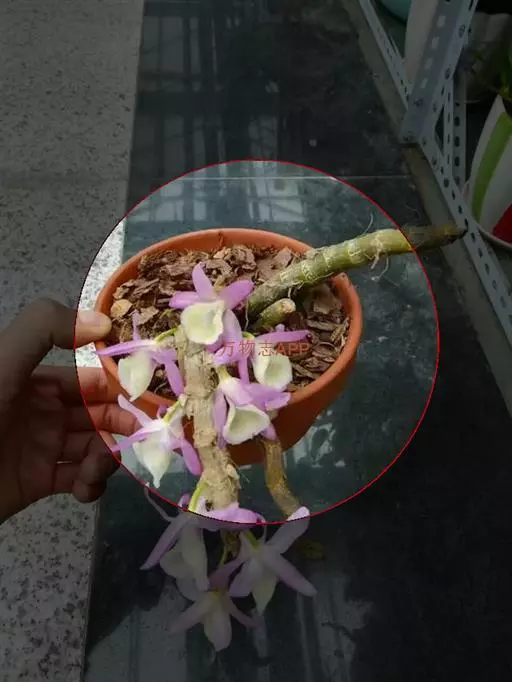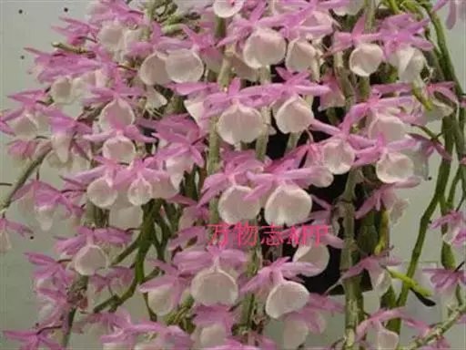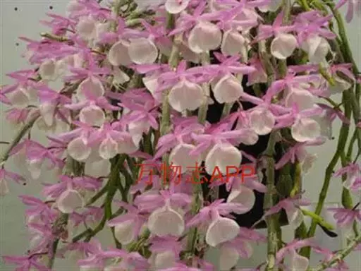 报春石斛(学名:Dendrobium primulinum Lindl. ):茎下垂,厚肉质,圆柱形,不分枝,具多数节,节间长2-2.5厘米。叶纸质,二列,互生于整个茎上,披针形或卵状披针形,基部具纸质或膜质的叶鞘。总状花序具1-3朵花,通常从落了叶的老茎上部节上发出;花开展,下垂,萼片和花瓣淡玫瑰色;花瓣狭长圆形,长3厘米,宽7-9厘米,先端钝,具3-5条脉,全缘;唇瓣淡黄色带淡玫瑰色先端,宽倒卵形,两面密布短柔毛,边缘具不整齐的细齿,唇盘具紫红色的脉纹。花期3-4月。
