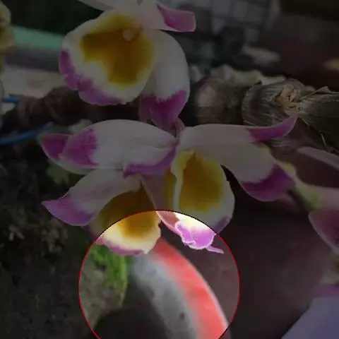花瓣狭长圆形,长3厘米,宽7-9厘米,先端钝,具3-5条脉,全缘;唇瓣淡黄色带淡玫瑰色先端,宽倒卵形,长小于宽,宽约3.5厘米,中下部两侧围抱蕊柱,两面密布短柔毛,边缘具不整齐的细齿,唇盘具紫红色的脉纹;蕊柱白色,长约3毫米;药帽紫色,椭圆状圆锥形,顶端多少凹的,密布乳突状毛,前端边缘宽凹缺。花期3-4月。