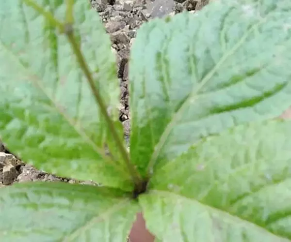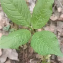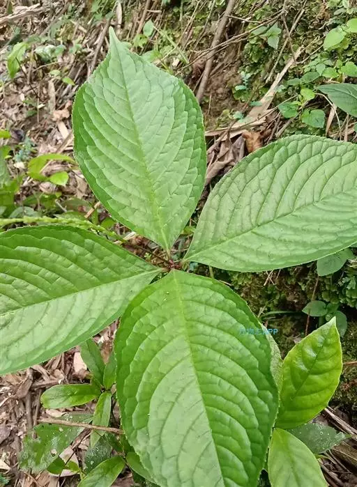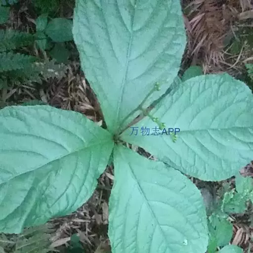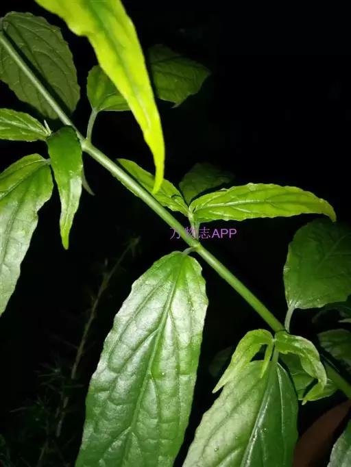 叶对生,通常4片生于茎上部,纸质,宽椭圆形、卵状椭圆形或倒卵形,长9-18厘米,宽5-9厘米,顶端渐尖,基部楔形至宽楔形,边缘具锯齿,齿端有一腺体,背面中脉、侧脉有鳞屑状毛;叶脉6-8对;叶柄长0.5-1.2厘米;鳞状叶卵状三角形,膜质。托叶小,钻形。