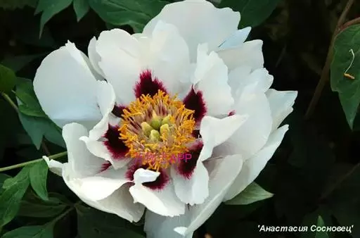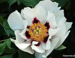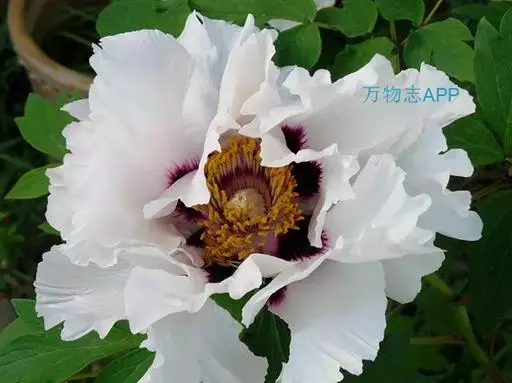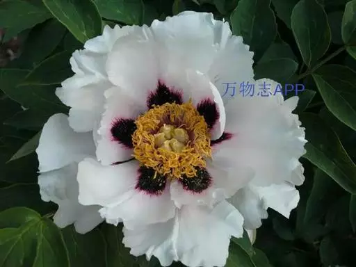 紫斑牡丹(学名:Paeonia suffruticosa Andr. var.papaveracea (Andr.) Kerner)是毛莨科芍药属植物,落叶灌木,茎高达2米,分枝短而粗。叶为二至三回羽状复叶,小叶不分裂。花单生枝顶,直径10-17厘米;花梗长4-6厘米;花瓣内面基部具深紫色斑块,倒卵形,顶端呈不规则的波状;花盘革质,杯状,紫红色,顶端有数个锐齿或裂片,完全包住心皮,在心皮成熟时开裂。瞢荚果长圆形,密生黄褐色硬毛。