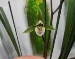 花序生于叶腋,远比叶长,多分枝;花序柄粗壮,近直立,圆锥花序具多数花;花苞片小,卵形,长约2毫米,先端急尖;花梗和子房长约1厘米;花开展,萼片和花瓣在背面黄绿色,内面紫褐色,边缘和中肋黄色;中萼片近长圆形,凹的,长4.5毫米,宽2毫米,先端钝;侧萼片斜长圆形,约等大于中萼片,基部贴生于蕊柱足。