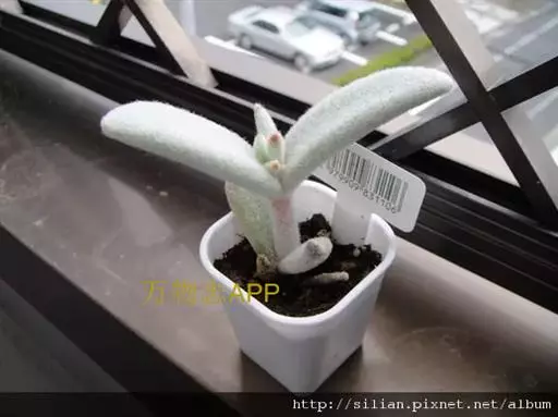 福兔耳(Kalanchoe eriophylla Hilsenberg & Bojer ex Tulasne)是景天科伽蓝菜属的多肉植物 ,野外分布于非洲马达加斯加中部。 植株叶片对生,长梭型,整个叶片及茎干密布白色绒毛。叶片顶端微金黄,叶尖圆型。初夏开花,聚伞花序,花序较高,小花管状向上,花开白粉色,花瓣4片,花期较长。喜阳光充足的环境,夏季要适当遮荫,不能过于荫蔽。喜温暖,冬季温度不能低于10度。生长很缓慢。
