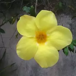 黄蝉属,夹竹桃科,约15种,分布于热带美洲,中国引入栽培的有黄蝉A. neriifolia Hook. 和软枝黄蝉 A. cathartica L. 2种,广州极常见,供观赏。直立或藤状灌木;叶生或轮生;花大而美丽,黄色,数朵排成总状花序,萼5深裂,基部里面无腺体;花冠钟状或漏斗状,喉部有被毛的鳞片;花药与花柱分离;花盘环状,全缘或5裂;子房1室,具两个侧膜胎座,有胚珠多颗;果为一有刺的蒴果,开裂为2果瓣;种子有翅。