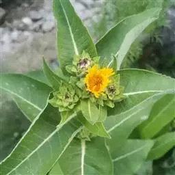 叶长圆状披针形至披针形,长6-10厘米,宽1.5-2.5厘米;下部叶较小,在花期枯萎,中部以上叶无柄,基部稍狭并扩大成圆耳形,抱茎,边缘有小尖头状疏锯齿,顶端渐尖,下面有黄色腺点,脉上有短柔毛,上面无毛;中脉和7-8对侧脉在下面稍高起,网脉明显。