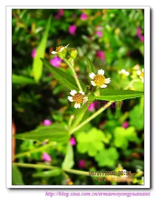牛膝菊(拉丁学名:Galinsoga parviflora Cav.)是菊科,牛膝菊属一年生草本植物,高可达80厘米。茎纤细,叶对生,叶片卵形或长椭圆状卵形,有叶柄,头状花序半球形,有长花梗,总苞半球形或宽钟状,总苞片外层短,内层卵形或卵圆形,舌状花,舌片白色,筒部细管状,托片纸质,瘦果常压扁,7-10月开花结果。