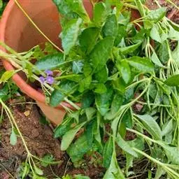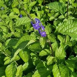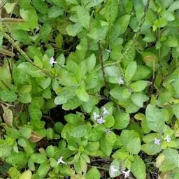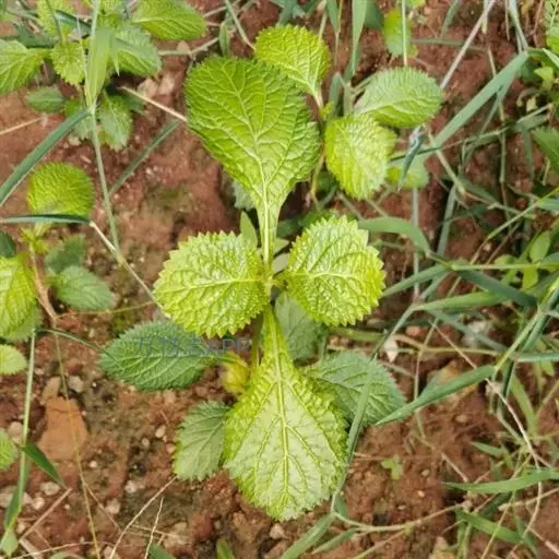 多年生草本植物,低矮、伸展,株高可达80-100厘米;茎基部稍木质化,茎、枝二歧状分枝,幼枝或节被毛;叶对生,灰绿色或蓝绿色,叶厚纸质,叶片常呈椭圆形至椭圆状长圆形,长5-9厘米,宽3-5厘米,叶基楔状,鲜叶近轴面无泡状隆起的细皱,腹面主脉有时略呈紫红色,叶脉处的上下表皮略被疏短毛,侧脉3-5,叶尖钝或圆形,叶缘的锯齿略钝、较宽,齿尖朝前而呈锯齿状,齿数较少;叶柄具翅,长2-3厘米。
