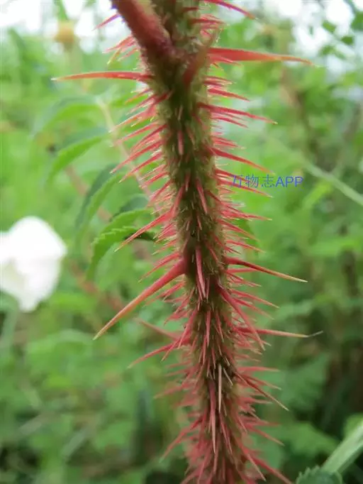 刺蔷薇是灌木,高1-3米;小枝圆柱形,稍微弯曲,红褐色或紫褐色,无毛;有细直皮刺,常密生针刺,有时无刺。小叶3-7,连叶柄长7-14厘米;小叶片宽椭圆形或长圆形,长1.5-5厘米,宽8-25毫米,先端急尖或圆钝,基部近圆形,稀宽楔形,边缘有单锯齿或不明显重锯齿,上面深绿色,无毛,中脉和侧脉稍微下陷,下面淡绿色,中脉和侧脉均突起,有柔毛,沿中脉较密;叶柄和叶轴有柔毛、腺毛和稀疏皮刺;托叶大部贴生于叶柄,离生部分宽卵形,边缘有腺齿,下面被柔毛。花单生或2-3朵集生,苞片卵形至卵状披针形,先端渐尖或尾尖,边缘有腺齿或缺刻,花梗长2-3.5厘米,无毛,密被腺毛;花直径3.5-5厘米;萼筒长椭圆形,光滑无毛或有腺毛;萼片披针形,先端常扩展成叶状,外面有腺毛或稀疏刺毛,内面密被柔毛;花瓣粉红色,芳香,倒卵形,先端微凹,基部宽楔形;花柱离开,被毛,比雄蕊短。果梨形、长椭圆形或倒卵球形,直径1-1.5厘米,有明显颈部,红色,有光泽,有腺或无腺。花期6-7月,果期7-9月。