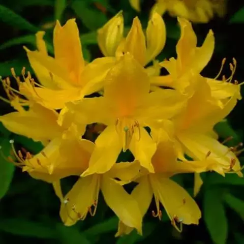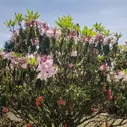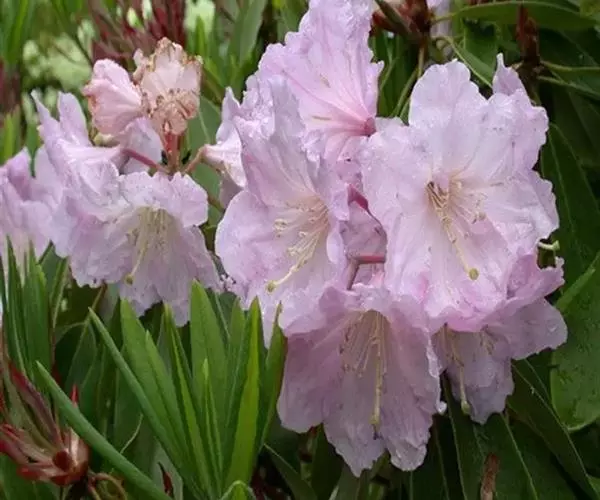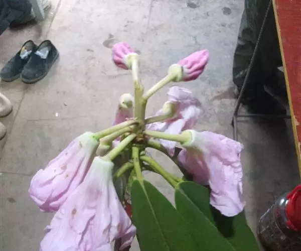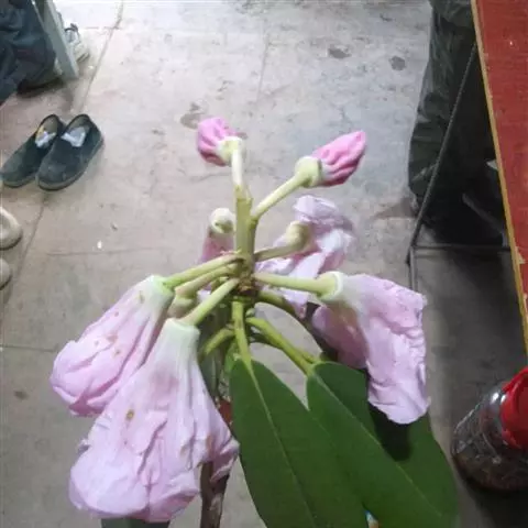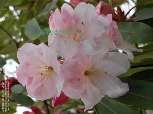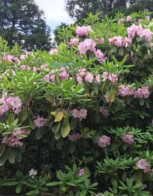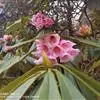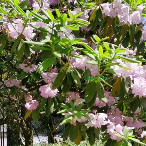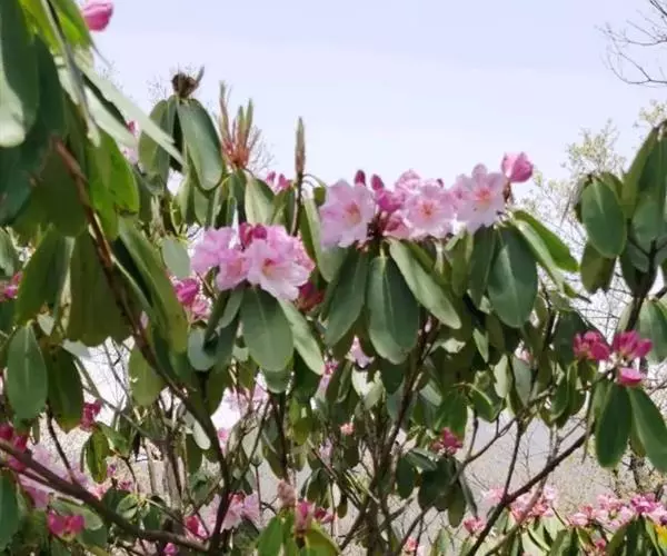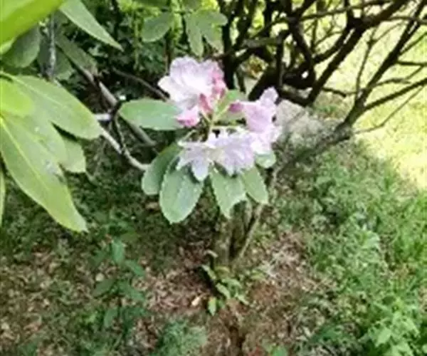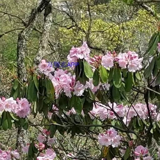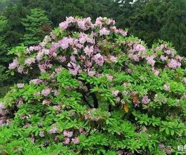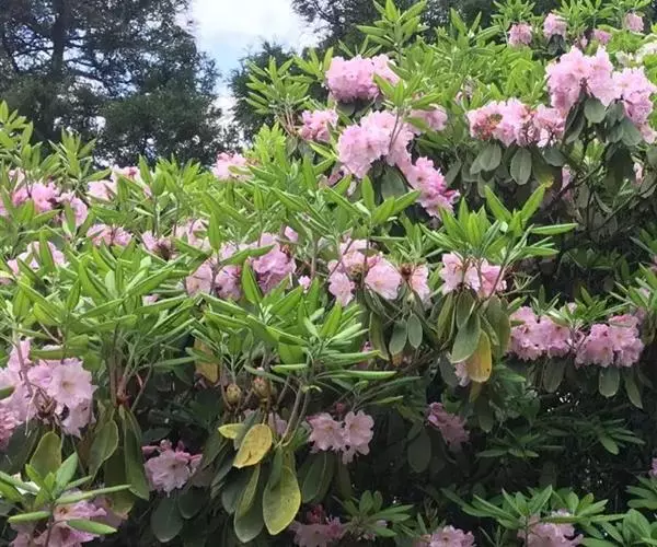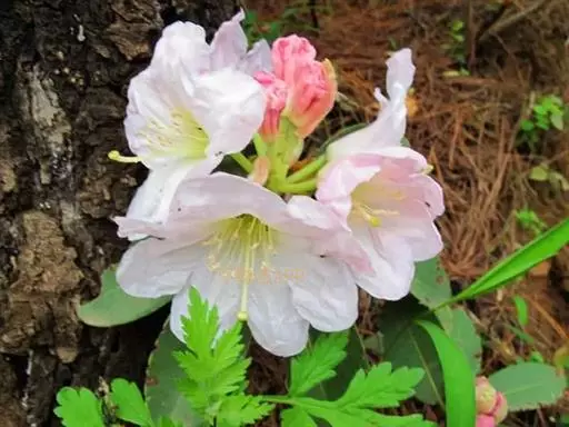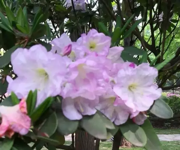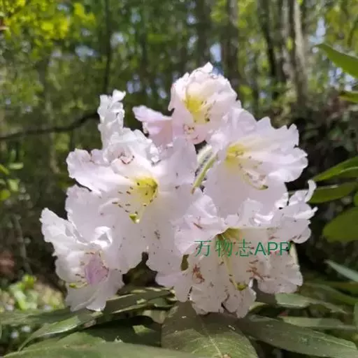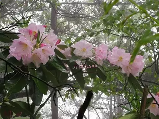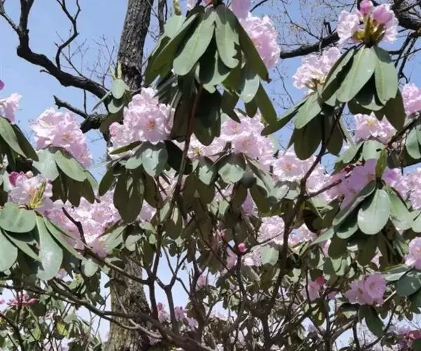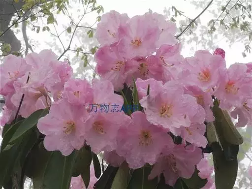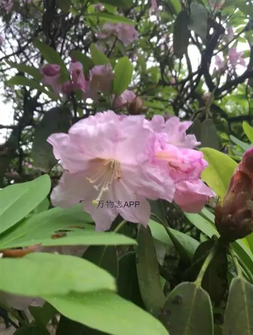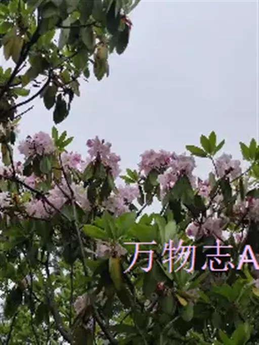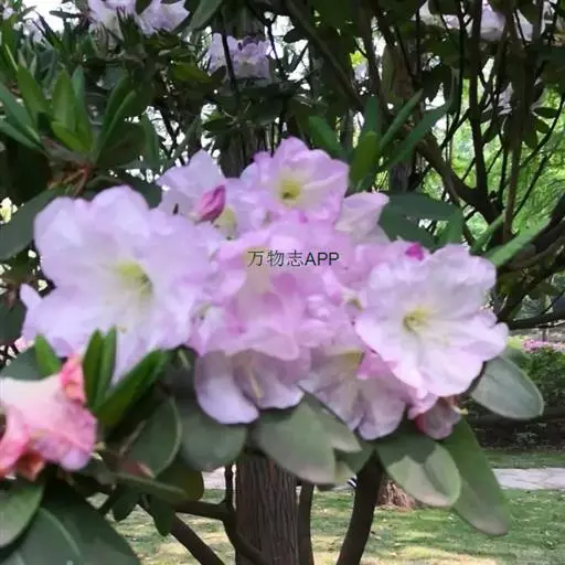云锦杜鹃(学名:Rhododendron fortunei Lindl.):常绿灌木或小乔木,高3-12米;主干弯曲,树皮褐色,片状开裂;幼枝黄绿色,初具腺体;老枝灰褐色。叶厚革质,长圆形至长圆状椭圆形,上面深绿色,有光泽,下面淡绿色。顶生总状伞形花序疏松,有花6-12朵,有香味;花冠漏斗状钟形,长4.5-5.2厘米,直径5-5.5厘米,粉红色,外面有稀疏腺体,裂片7,阔卵形。蒴果长圆状卵形至长圆状椭圆形,直或微弯曲。花期4-5月,果期8-10月。
