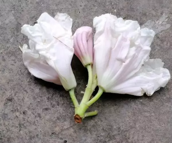 顶生总状伞形花序疏松,有花6-12朵,有香味;总轴长3-5厘米,淡绿色,多少具腺体;总梗长2-3厘米,淡绿色,疏被短柄腺体;花萼小,长约1毫米,稍肥厚,边缘有浅裂片7,具腺体;花冠漏斗状钟形,长4.5-5.2厘米,直径5-5.5厘米,粉红色,外面有稀疏腺体,裂片7,阔卵形,长1.5-1.8厘米,顶端圆或波状;雄蕊14,不等长,长18-30毫米,花丝白色,无毛,花药长椭圆形,黄色,长3-4毫米;子房圆锥形,长5毫米,直径4.5毫米,淡绿色,密被腺体, 10室,花柱长约3厘米,疏被白色腺体,柱头小,头状,宽2.5毫米。
