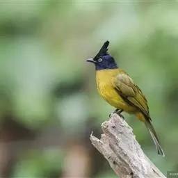 黑冠黄鹎:体长18-21厘米,是一种中等体型偏黄色鹎。整个头、颈、颏、喉黑色,头顶有显著直立的羽冠,…