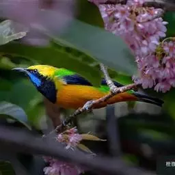 橙腹叶鹎体形大小和金额叶鹎相似,体长16~20厘米。额至后颈黄绿色,其余上体绿色,小覆羽亮钴蓝色,…