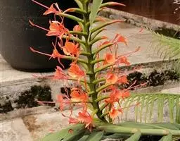 穗状花序长达20厘米;苞片披针形,长1.5-2.5厘米,内卷,无毛,内生一花;花萼管状,长1.7-2.8厘米,顶端具不明显的钝三齿,有缘毛;花冠管纤细,长3.5-5厘米,裂片线形,长2.5-3厘米;侧生退化雄蕊长圆状线形,基部收窄,较花冠裂片稍短,但较阔;唇瓣倒卵形,长约2厘米,2裂至中部,基部具瓣柄;花丝长3.5-4厘米,花药长1-1.2厘米;柱头具缘毛;子房被疏柔毛。