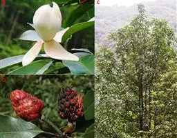 常绿乔木,高达26米,胸径80厘米,树皮灰白平滑。单叶互生薄革质,倒卵形,窄椭圆形或窄倒卵形,长10-20厘米,宽3.5-6.5厘米,先端短尖或渐尖,基部楔形,全缘,长10-20厘米,宽3.5-6.5厘米,直径2厘米,花被9片,乳白色或乳黄色,内质,稍厚。聚合果卵形,有种子5-6枚。花期4-5月,果熟期9-10月,成熟时,假种皮红色。