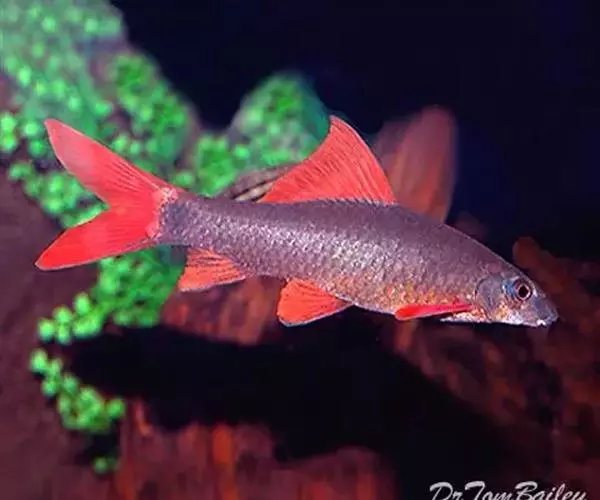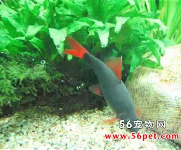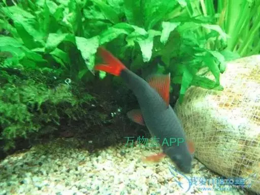 彩虹鲨身长8~10厘米。幼鱼尾鳍也成黑色,随着成长变成金黄色,接近成鱼时变成火红色。彩虹鲨适宜水温22度以上。对水质要求不严格,但要有水草、砂石、少光而水体宽大的环境。杂食性,低息生物、青苔、藻类、切碎烫过的菠菜叶、人工配和饲料等,他都摄食。有领地观念,如许多尾饲养于同一箱后,强者占领摄食栖息的有利地盘后,弱者休想进入。所以,不宜同种群养;不与小鱼混养,可以和其他大小相同的鱼混养。如水环境不宜,营养不良,尾鳍的颜色会变浅或返黄。 德国人把彩虹鲨称为“火尾鱼“,因为红尾黑鲨鱼遍体漆黑,只有尾鳍约的好象一团燃烧的烈火,当红尾黑 鲨鱼为幼时,身体各鳍呈黑色长到8厘米左右,尾鳍变为金黄色,长到10厘米时即达到性成熟时尾鳍才会变成鲜红色。水温过低时尾鳍的颜色便会退为橙黄色甚至会变成纯黑色。饲养缸可以铺上暗色的砂石,这样红尾黑鲨鱼的尾鳍会变得更红,缸中应多种水草,这种鱼的胆子小,在缸中放入两面个花盆供它们藏匿之用,不要放在光线太强的地方。红尾黑鲨鱼爱的水的下层游动,但是常常可以看到它们在不中上下游动,追逐嬉戏。它对水质要求不严格,在22-30度水温下生长良好,可以和体形较大的热带鱼混养,红尾黑鲨鱼爱吃动物性饵料。但是经常吸吮鱼缸上的青苔经常喂给一些切碎焯过的波菜会使其身上的颜色更加明丽。