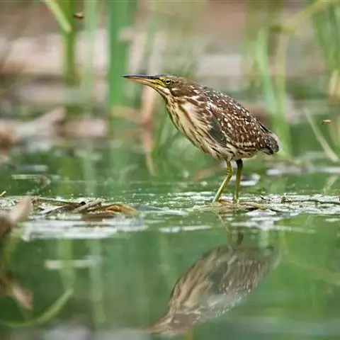 小白鹭(学名:Egretta garzetta):体长52-68厘米,为中型涉禽,全身体羽颇似大、中白鹭,体形纤瘦,全身白色。夏羽枕部有两根细长饰羽,前颈和背着生蓑羽。冬季饰羽及蓑羽脱落。眼先裸皮夏季粉红色,冬季黄绿色。生殖期在枕部有两枚长羽,如双辫状。胸前亦簇生矛状长羽,但没有枕部冠翎长。背上蓑羽的先端均微向上卷曲。生殖期后,冠翎和蓑羽均脱落。眼黄色,嘴黑色,下嘴基部带苍白色,面部裸皮灰色,脚、腿黑色,趾上常杂有黄色。栖息于平原、丘陵和低海拔之湖泊、沼泽地带与滩涂地。以鞘翅目及鳞翅目幼虫、水生昆虫等动物性食物为食,也吃少量谷物等植物性食物。
