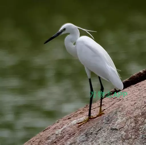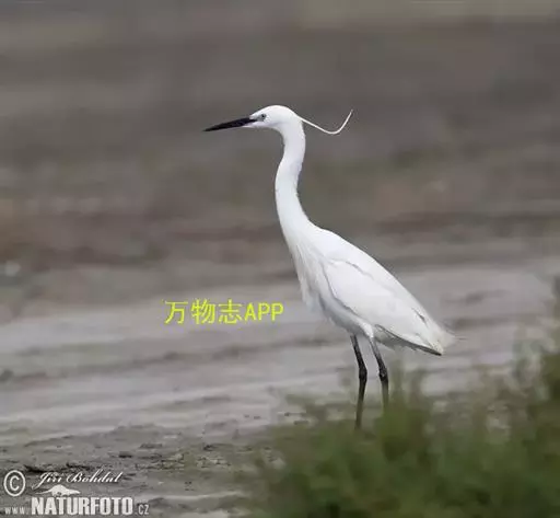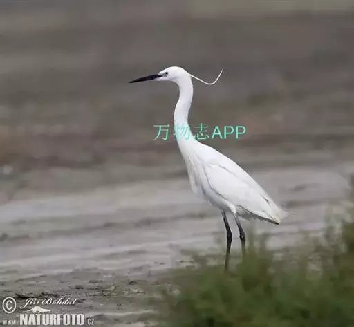 中型涉禽,体长52-68厘米。嘴、脚较长,黑色,趾黄绿色,颈甚长,全身白色。繁殖期枕部着生两根狭长而软的矛状饰羽。背和前颈亦着生长的蓑羽。 眼睑粉红色。嘴、颈和脚均甚长,通体白色。