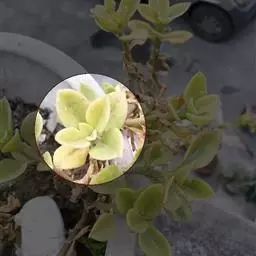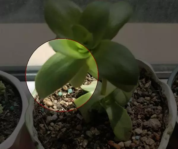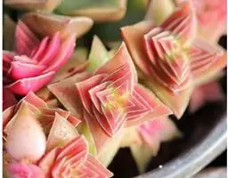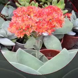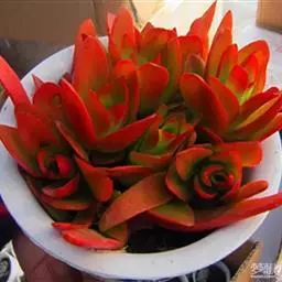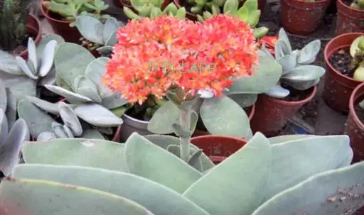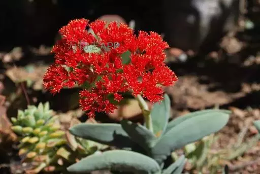 叶子表面宽厚,富肉质感且带有磨纱质感,看像石头质地;开红色小花,生于植株顶部,倒伞形密生,形状像花…
