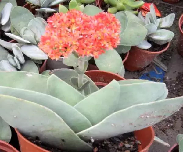 多浆肉质半灌木。株高1米左右。茎直立,分枝少。单叶互生或近轮生,尖刀形,叶长7-10厘米,宽3-4厘米,多汁,成对排列,侧向压缩,上升展开,末端钝,肉质肥大,灰绿色,叶基部联合,叶的边缘镶有细齿。伞房状聚伞花序,顶生,花深红色或橘红色,长达7毫米;花梗细长,高达100毫米。种子很小。花期夏季。