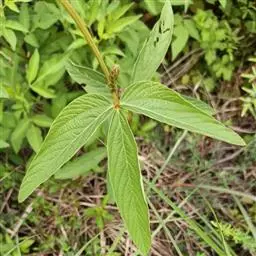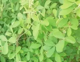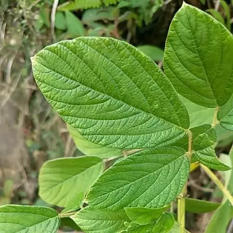 直立或披散亚灌木。幼枝三棱柱状,密被灰褐色短柔毛。叶具指状3小叶;托叶线状披针形,长约0.6-1厘米,有纵纹,被毛,先端细尖,宿存;叶柄长2-2.5厘米;小叶厚纸质,长椭圆形或卵状披针形,偏斜长4-7(-9)厘米,宽1.7-3厘米,先端钝,有时有小凸尖,基部圆形,上面被疏短柔毛,背面密被灰褐色柔毛;基出脉3,侧脉及网脉在上面多少凹陷,下面凸起,侧生小叶略小;小叶柄极短,密被短柔毛。