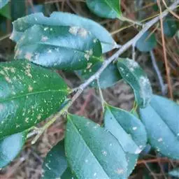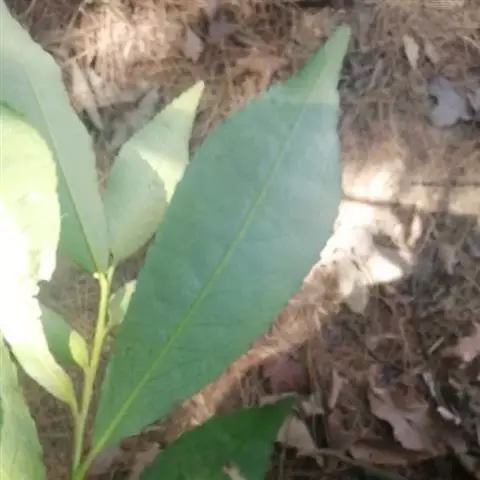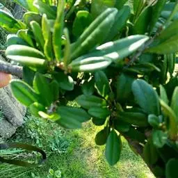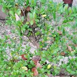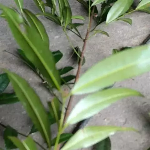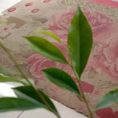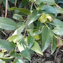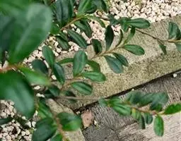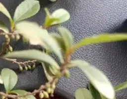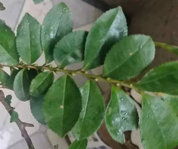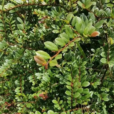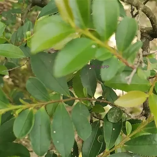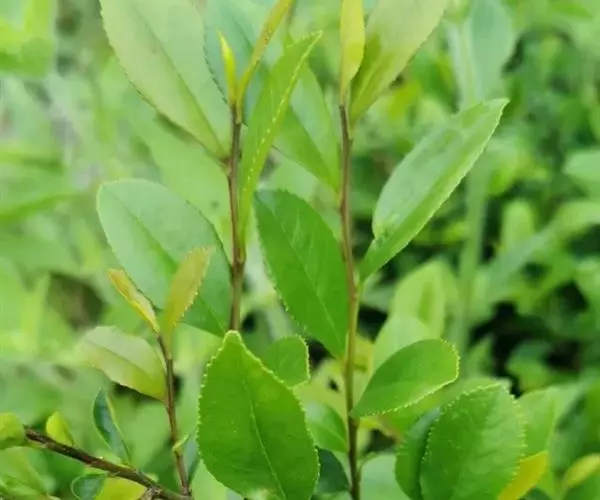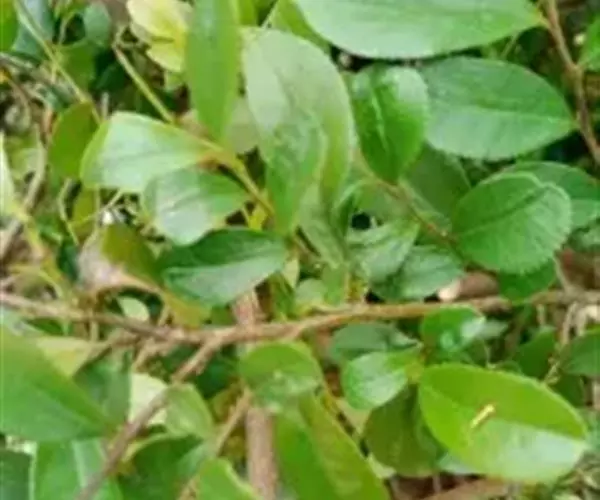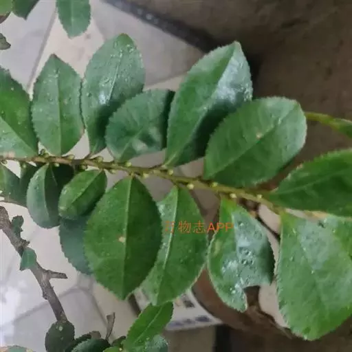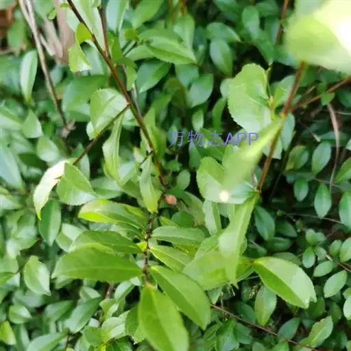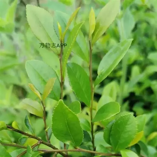 叶薄革质,倒卵形或倒卵状椭圆形,长2-5.5厘米,宽1-2厘米,顶端钝而有微凹或略尖,偶有近圆形,基部楔形,边缘密生细锯齿,有时稍反卷,上面鲜绿色,有光泽,下面淡绿色,无毛或初时疏被短柔毛,后变无毛,中脉在上面凹下,下面凸起,侧脉6-8对,两面均不甚明显;叶柄长2-3毫米。