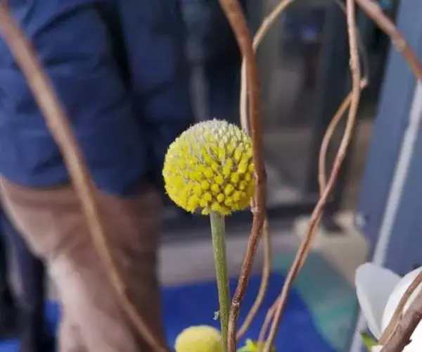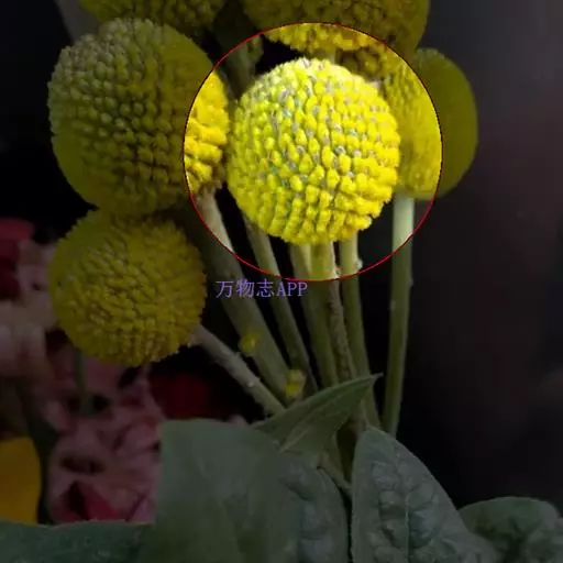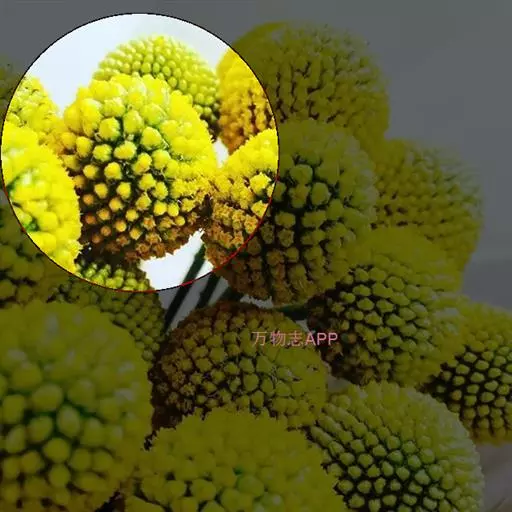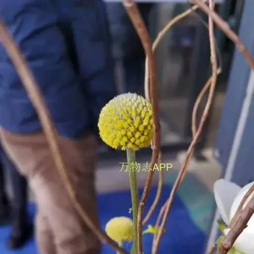 多年生植物,叶窄披针形,有蜡质,被灰白色柔毛,叶色灰绿、莲座化基生,植株丛生;花茎直立少分枝,顶生亮黄色的球形花,由多数管状花组成团伞花序,鼓槌状或金球状,高50~60cm。基部莲座状,丛生。叶窄披针形,有蜡质,被灰白色柔毛。花金黄色,由无数筒状花组成球形,花期7~8月。原产澳大利亚。