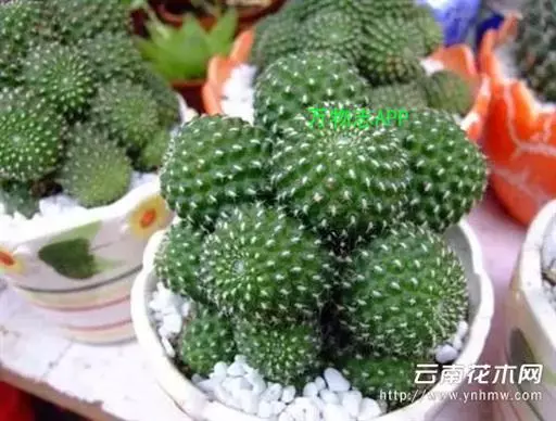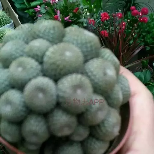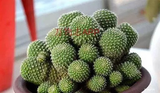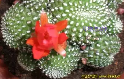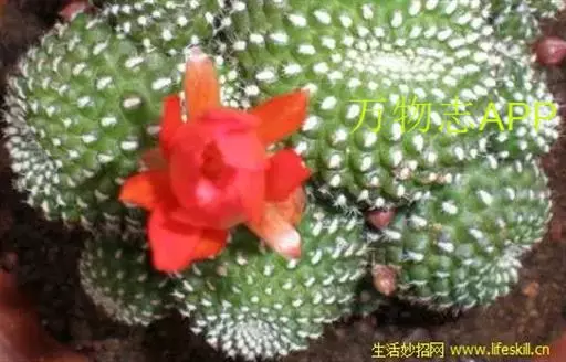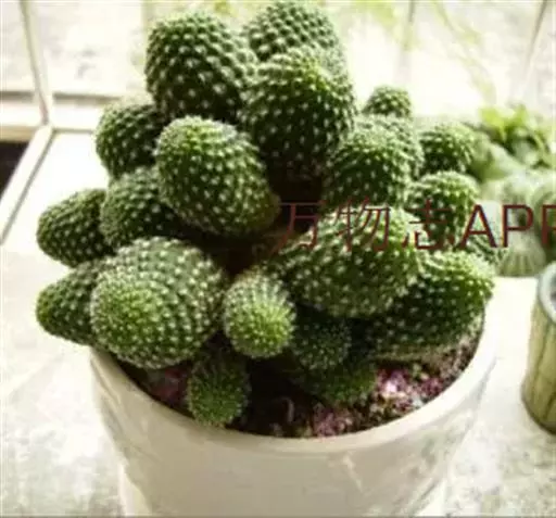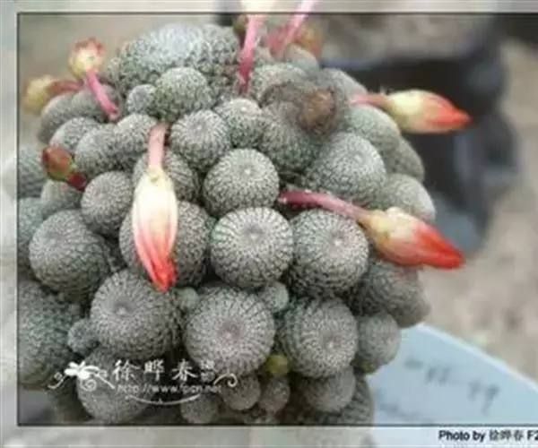 植株小,球形至圆筒状,基部易生出仔球而丛生,大大小小,叠垒成群。球体鲜绿色或墨绿色,棱角由螺旋状的疣瘤组成,棱16-20,疣粒顶端为刺座,生有灰白色的弯刺,刺25-30,白色或淡黄色,长0.2-0.3厘米。花着生在球下部刺座上,花小,红色,花筒长而细,自花受精。花期3-5月。盛开时,花朵数十朵,呈现倒钟形。花后坐果,小浆果圆形,浆果幼时绿色,6-7月,果实成熟,成熟的果实为橘红色。种子黑色。