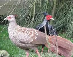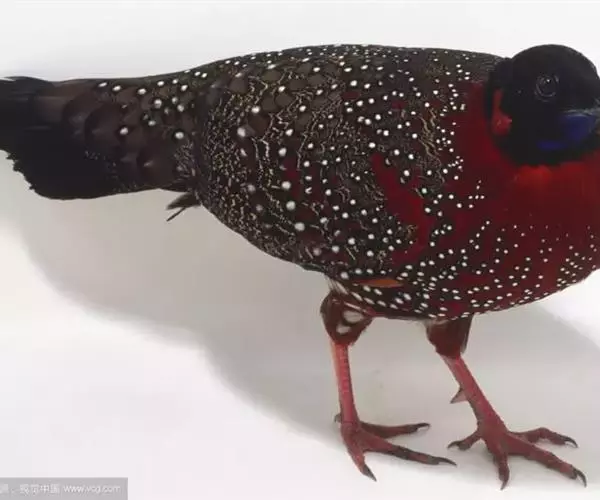 它的脸颊裸出,露出天蓝色的皮肤,周缘围着一圈桔黄色的羽毛。头、颈的后部和上胸为橙红色,尾羽为棕黄色,杂有黑色的虫蠹状斑,并具有黑色的横斑和端斑。其余体羽都是深栗红色,上面布满了圆圆的灰色眼状斑,背部的较小,胸、腹部的比较大,就像是红色的锦缎上洒满了大大小小的珍珠。由于雄鸟美丽的羽色和体 雄性红腹角雉 态,人们还给它起了许多优美动听的名字,如“秀鸡”、“星绣鸡”、“岩角鸡”、“大红鸡”等等。 与雄鸟相比,雌鸟的羽色就逊色多了,体长44—66厘米,体重830—1300克。上体一般为灰褐色,下体淡皮黄色,均布满了黑色的斑纹和白色的斑点。不过这种天然的保护色,可以使它在孵卵时免遭天敌的袭击。