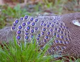 此外,在它的项下还生有一块图案奇特的肉裙,色彩绚丽而富于变幻,两边分别有八个镶着白边的鲜红色斑块,中间在黑色的衬底上散布着许多天蓝色的斑点,有人说这些斑点很象草书的“寿”字,所以又称它为“寿鸡”,视为长寿和好运的象征。